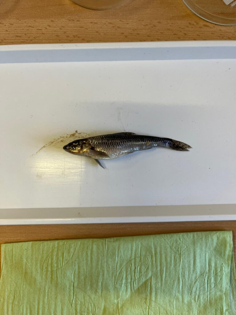 Dnes jsme na hodině přírodopisu nakoukli do vnitřní stavby těla ryby. Nebyla to ryba velká, malý hrouzek, ale na ukázku plynového měchýře, šupin a čočky v oku to stačilo…..