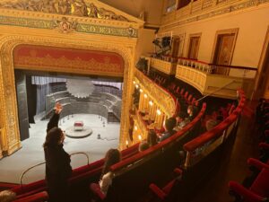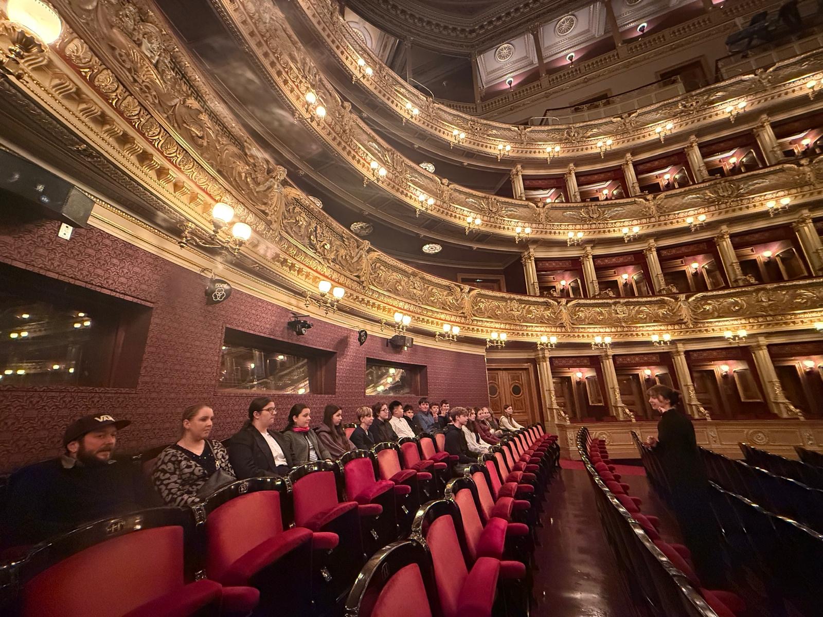 Odpoledne nás čekala prohlídka historické budovy Národního divadla. Dozvěděli jsme se spoustu zajímavostí o jeho vzniku, architektuře i fungování divadla jako takového. Měli jsme možnost projít se reprezentativními prostory, nahlédnout do hlediště a zjistit, co všechno se skrývá za slavnou oponou.