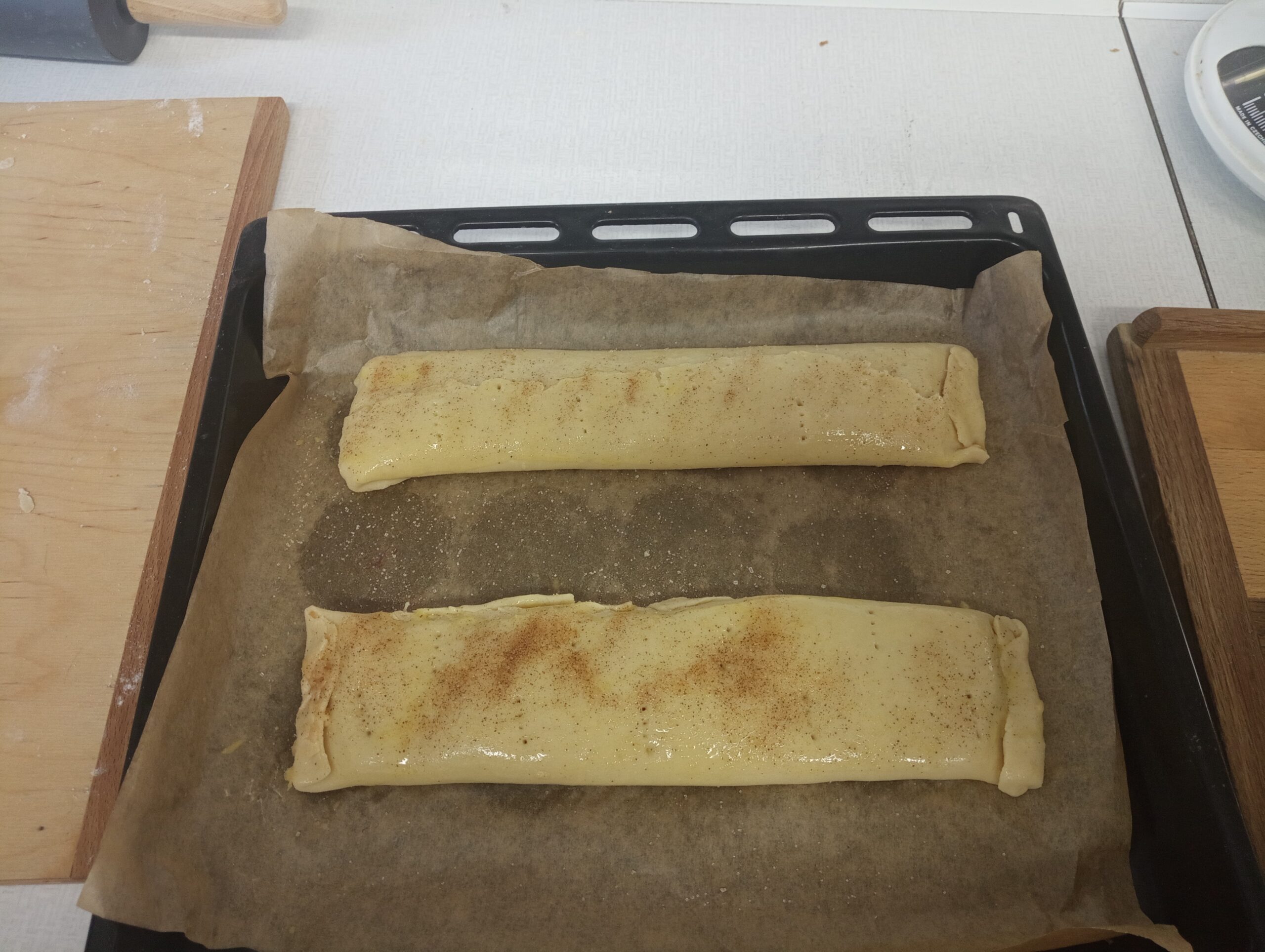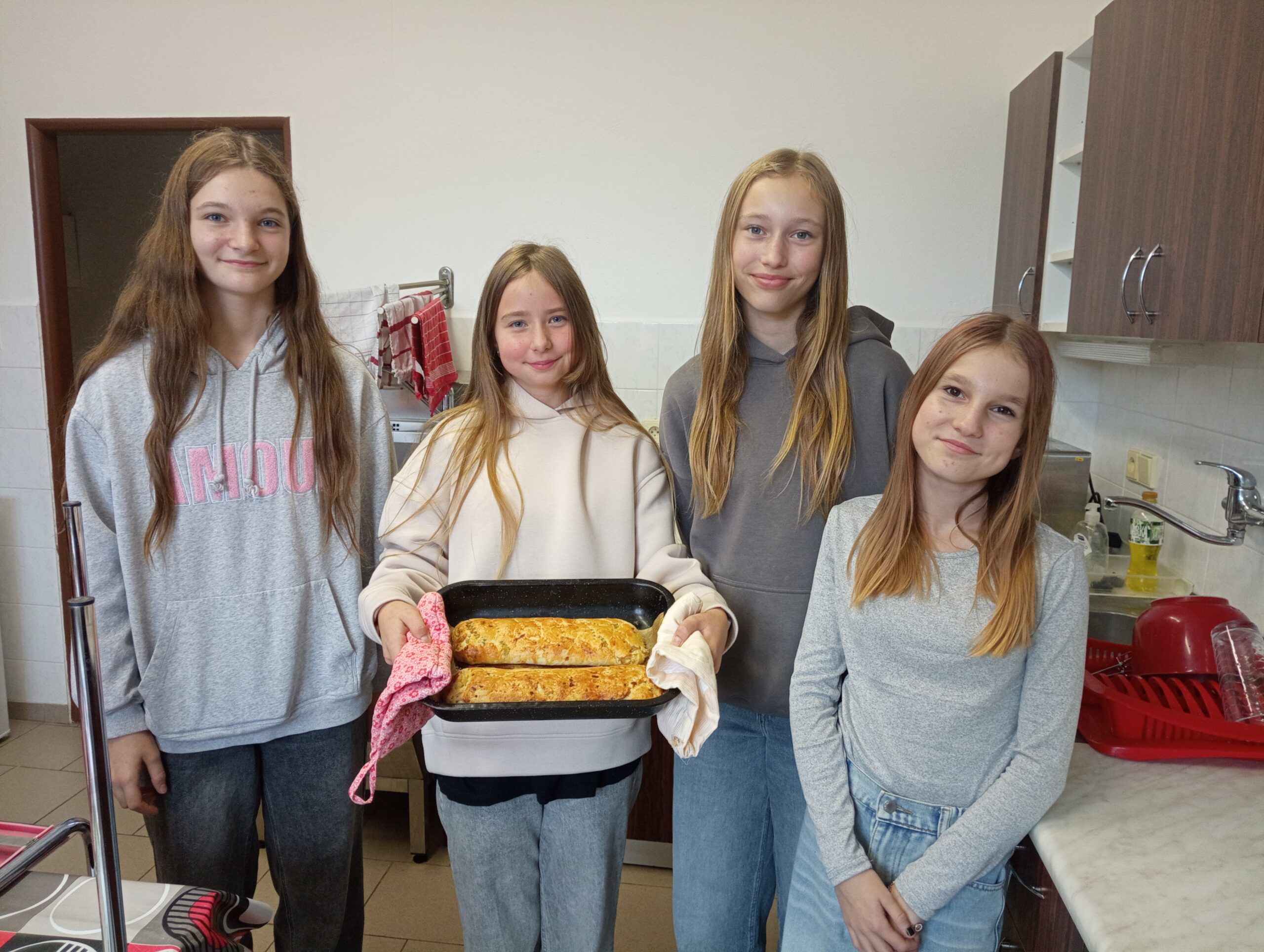 Ve středu 8. října se kuchyňka proměnila v cukrárnu – děvčata ze sedmých tříd se pustila do pečení jablečného štrůdlu. Každá skupina (po 3–4 žákyních) zvládla upéct dvě voňavé šišky podle jednoduchého receptu: 200 g hladké mouky, 125 g Omegy, 1 vejce, 2 lžíce mléka, 2 lžíce octa a špetka soli. Náplň tvořila oloupaná a nastrouhaná jablka smíchaná se skořicí a trochou vanilkového cukru, těsto se nakonec potřelo rozšlehaným vajíčkem. Výsledek? Sladká odměna za skvělou spolupráci!
