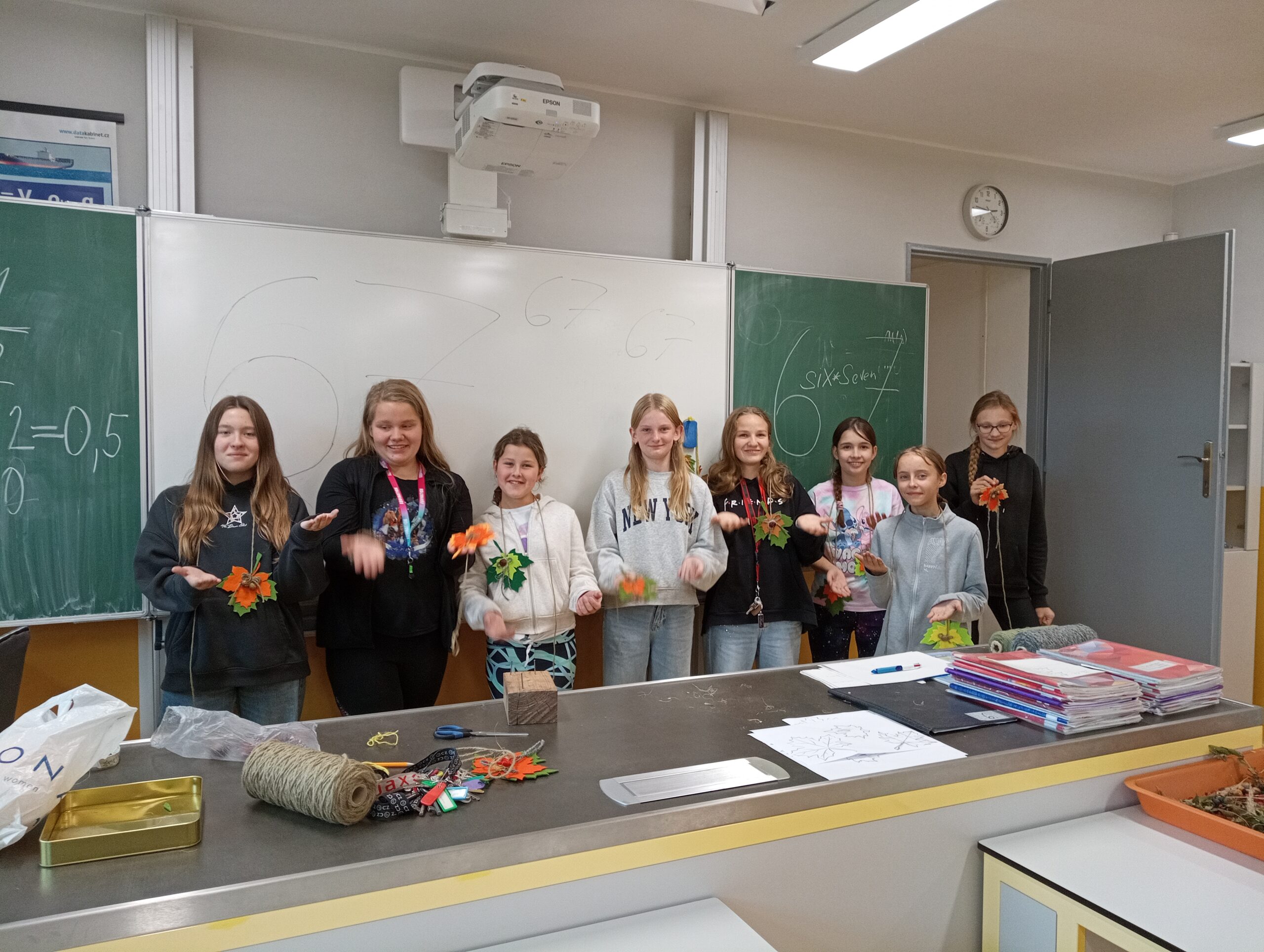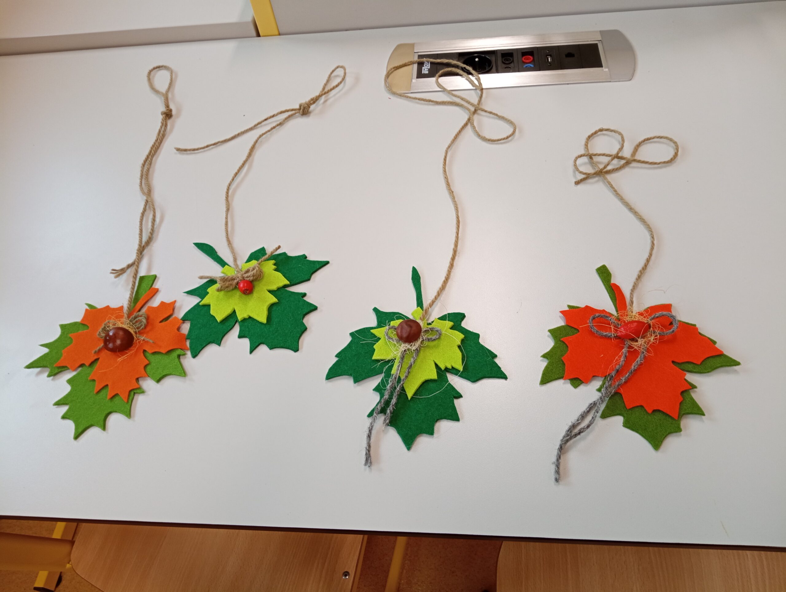 Děvčata ze 6. třídy se s chutí pustila do výroby dekorací na podzimní libštácké trhy. Z barevného flísu vystřihly listy ve tvaru javoru, slepily vždy dva k sobě a vytvořily tak pevný základ. Každý výrobek pak ozdobily lýkem, provázkem, šípky, kaštany a oříšky – výsledkem byly krásné přírodní dekorace plné podzimní atmosféry. Těšíme se, až je uvidíme na trhu!